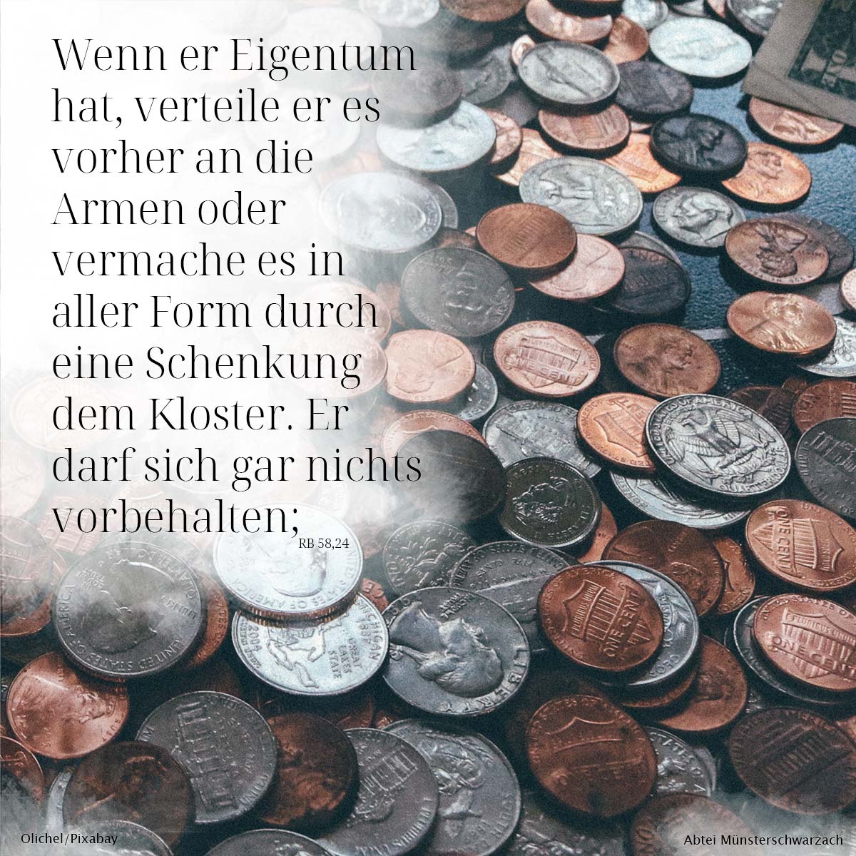 24. Wenn er Eigentum hat, verteile er es vorher an die Armen oder vermache es in alles Form durch eine Schenkung dem Kloster. Er darf sich gar nichts vorbehalten;