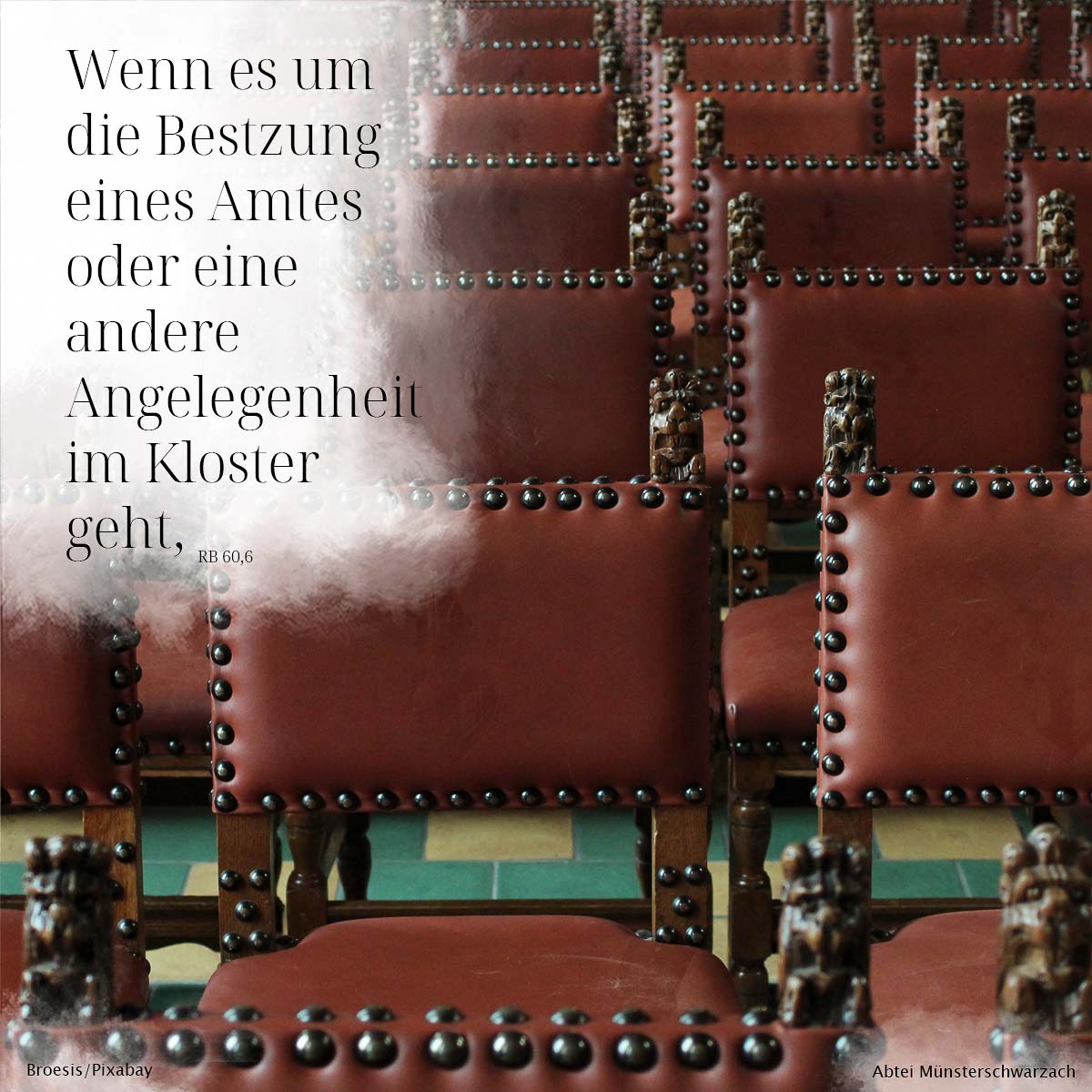 RB 60,6 Benediktsregel 60. Kapitel 6. Wenn es um die Besetzung eines Amtes oder eine andere Angelegenheit im Kloster geht,Benedikt leitet die Besetzung von Ämtern und Aufgaben für Priester mit diesem Vers ein.