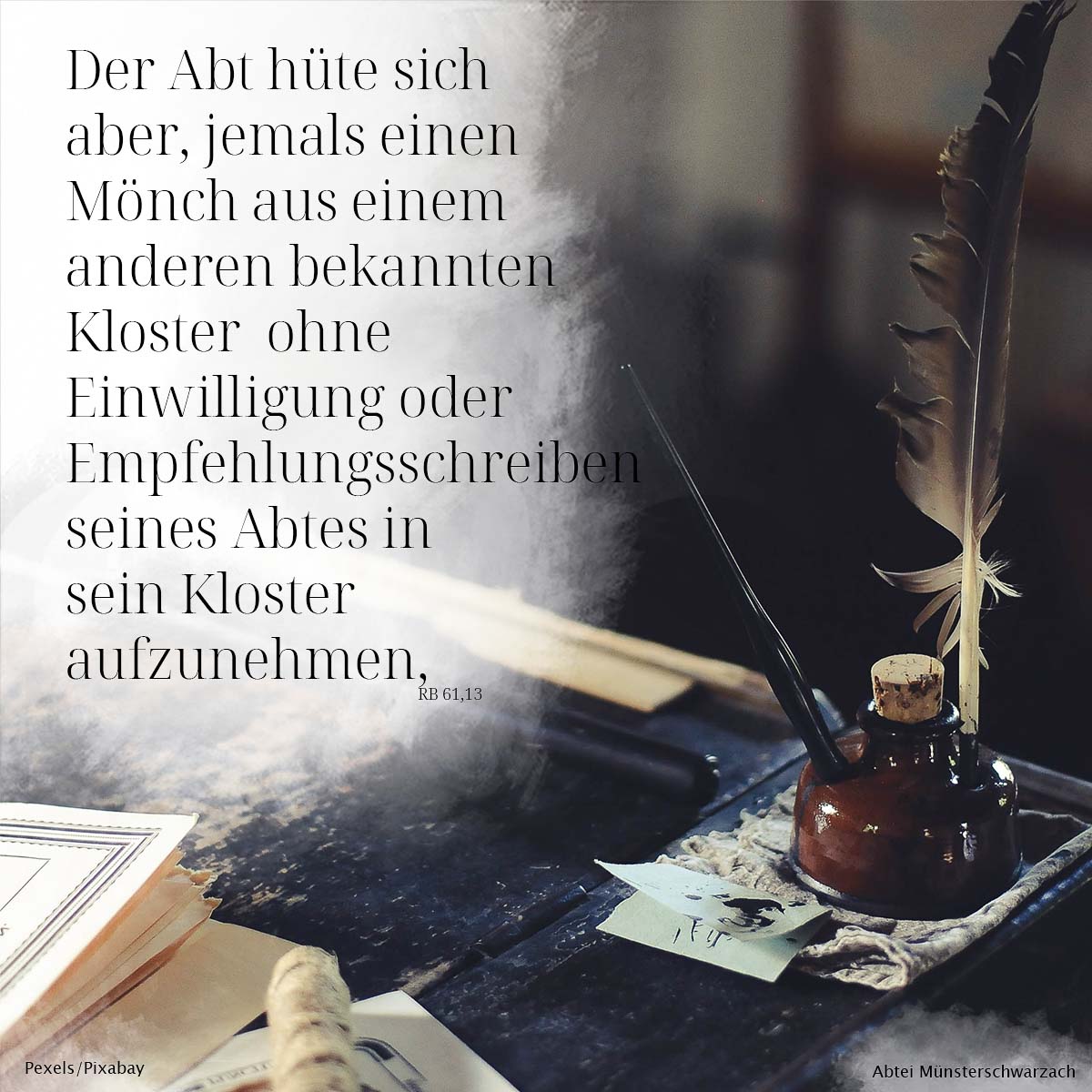 13. Der Abt hüte sich aber, jemals einen Mönch aus einem anderen bekannten Kloster ohne Einwilligung oder Empfehlungsschreiben seines Abtes in sein Kloster aufzunehmen.