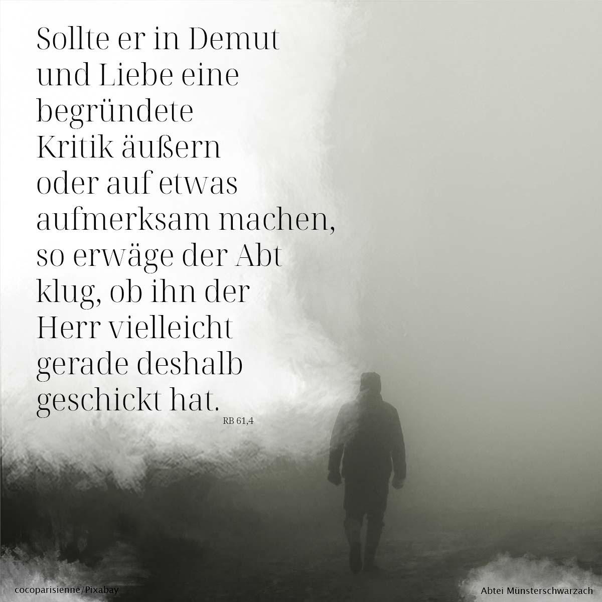 4. Sollte er in Demut und Liebe eine begründete Kritik äußern oder auf etwas aufmerksam machen, so erwäge der Abt klug, ob ihn der Herr vielleicht gerade deshalb geschickt hat.
