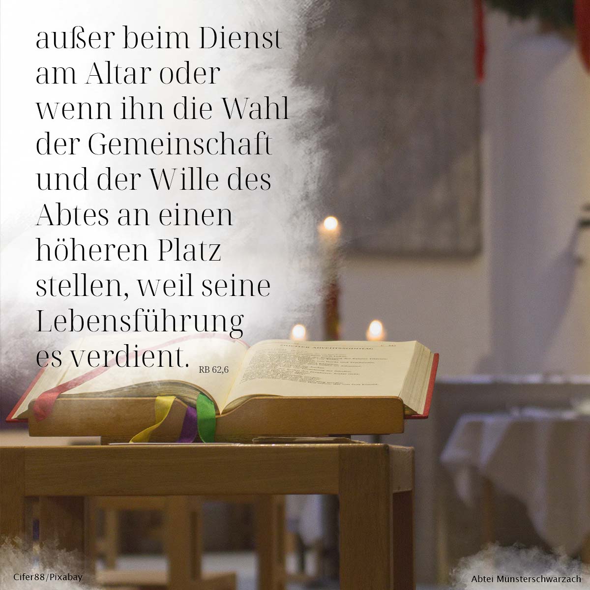 6. außer beim Dienst am Altar oder wenn ihn die Wahl der Gemeinschaft und der Wille des Abtes an einen höheren Platz stellen, weil seine Lebensführung es verdient.