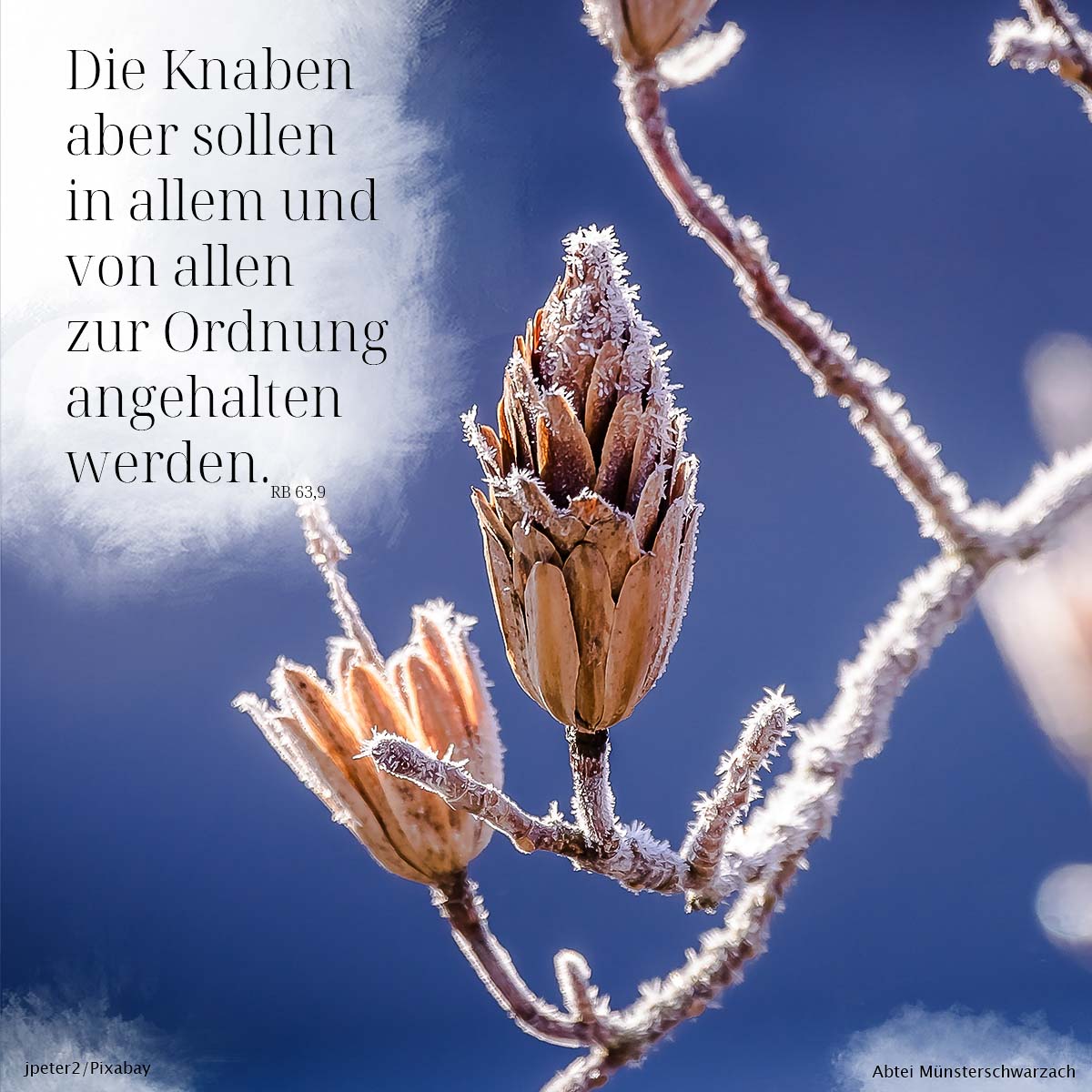 RB 63,9 Benediktsregel 63. Kapitel 9. Die Knaben aber sollen in allem und von allen zur Ordnung angehalten werden.Eine separate Anweisung gibt es für Knaben (damals noch üblich), da diese in Benedikts Augen besondere Aufmerksamkeit erfordern.