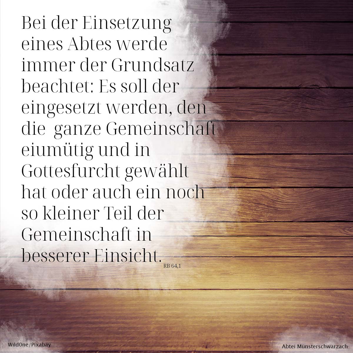 1. Bei der Einsetzung eines Abtes werde immer der Grundsatz beachtet: Es soll der eingesetzt werden, den die ganze Gemeinschaft einmütig in Gottesfurcht gewählt hat oder auch ein noch so kleiner Teil der Gemeinschaft in besserer Eintracht.