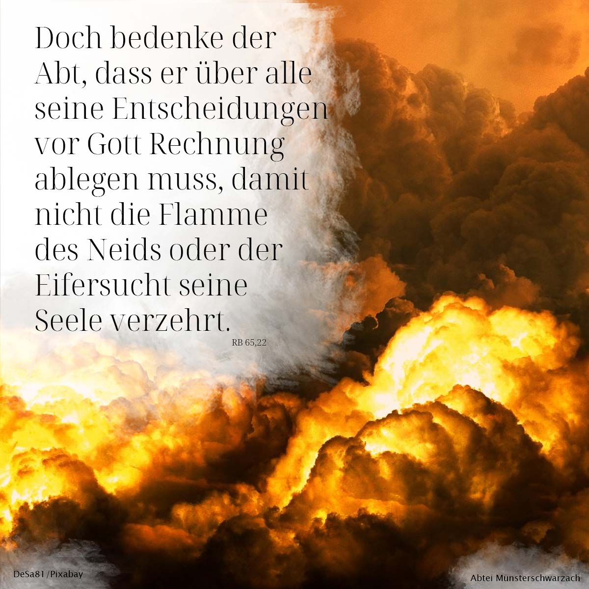 22. Doch bedenke der Abt, dass er über alle seine Entscheidungen vor Gott Rechenschaft ablegen muss, damit nicht die Flamme des Neids oder der Eifersucht seine Seele verzehrt.