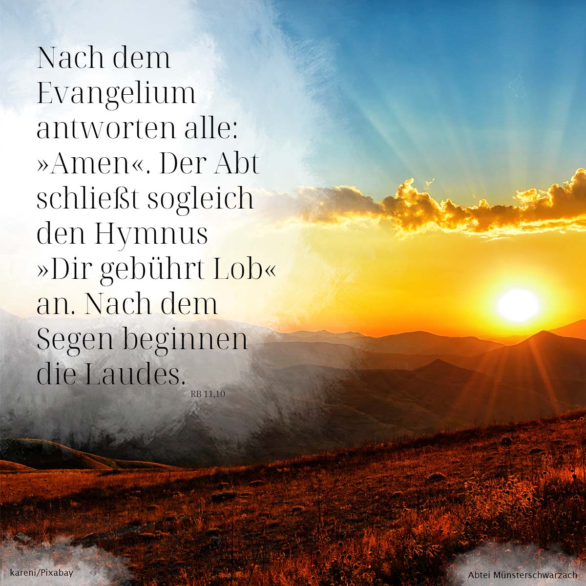 10. Nach dem Evangelium antworten alle: »Amen «. Der Abt schließt sogleich den Hymnus »Dir gebührt Lob« an. Nach dem Segen beginnen die Laudes.