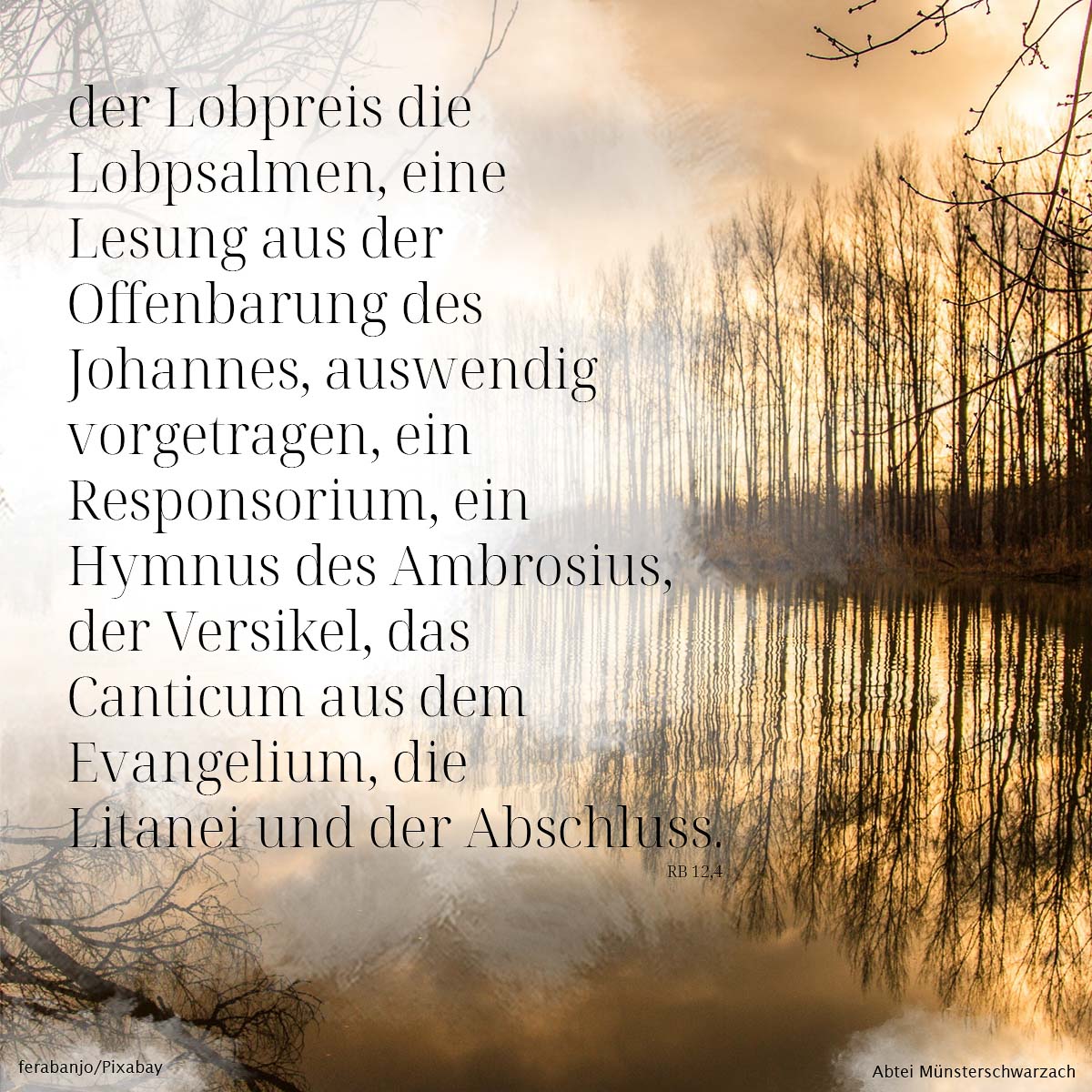 4. der Lobpreis, die Lobpsalmen, eine Lesung aus der Offenbarung des Johannes, auswendig vorgetragen, ein Responsorium, ein Hymnus des Ambrosius, der Versikel, das Canticum aus dem Evangelium, die Litanei und der Abschluss.