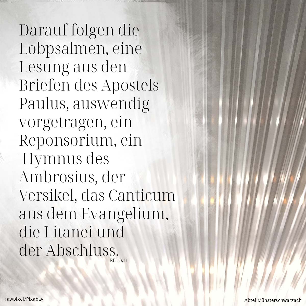 11. Darauf folgen die Lobpsalmen, eine Lesung aus den Briefen des Apostels Paulus, auswendig vorgetragen, ein Responsorium, ein Hymnus des Ambrosius, der Versikel, das Canticum aus dem Evangelium, die Litanei und der Abschluss.