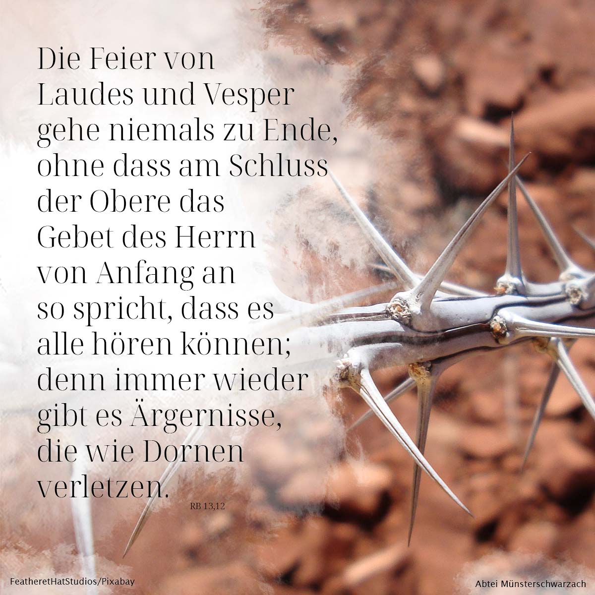 12. Die Feier von Laudes und Vesper gehe niemals zu Ende, ohne dass am Schluss der Obere das Gebet des Herrn von Anfang an so spricht, dass es alle hören können; denn immer wieder gibt es Ärgernisse, die wie Dornen verletzen.
