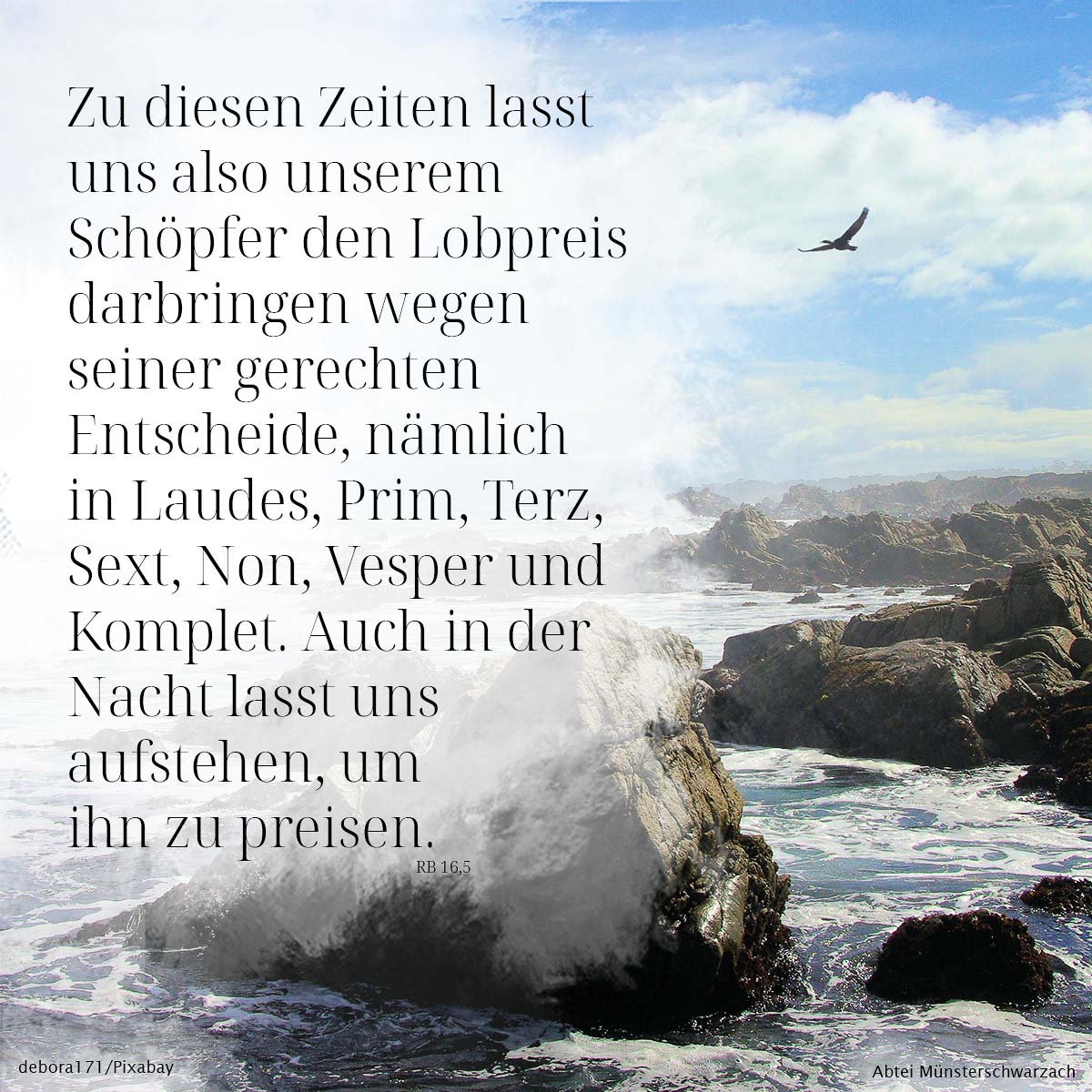5. Zu diesen Zeiten lasst uns also unserem Schöpfer den Lobpreis darbringen wegen seiner gerechten Entscheide, nämlich in Laudes, Prim, Terz, Sext, Non, Vesper und Komplet. Auch in der Nacht lasst uns aufstehen, um ihn zu preisen.