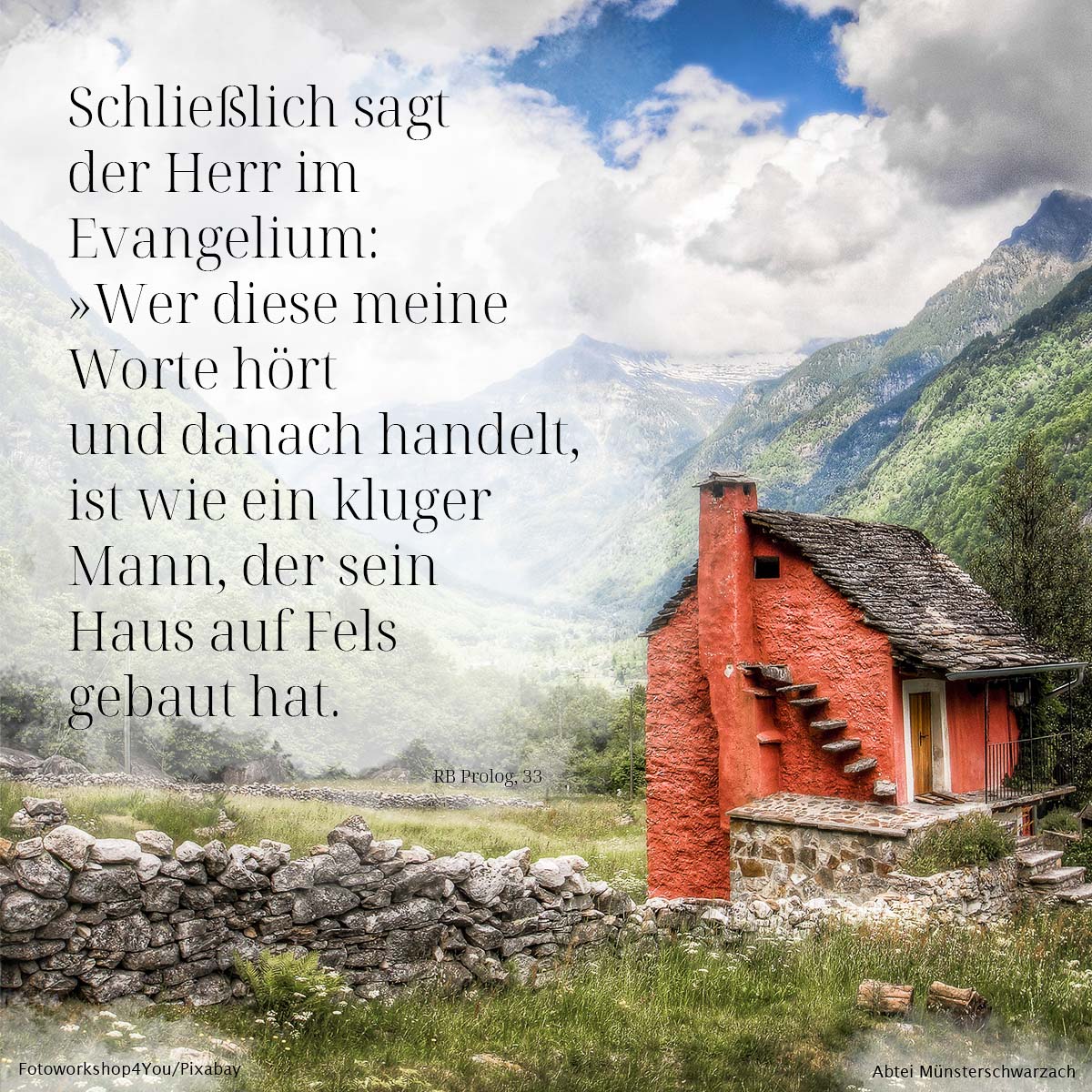 33. Schließlich sagt der Herr im Evangelium: »Wer diese meine Worte hört und danach handelt, ist wie ein kluger Mann, der sein Haus auf Fels gebaut hat.