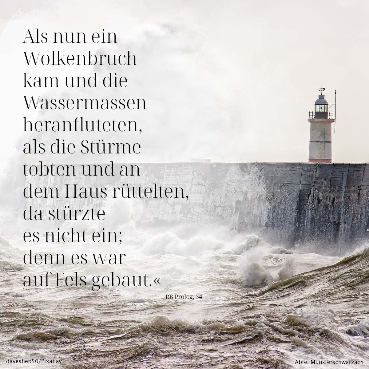 34. Als nun ein Wolkenbruch kam und die Wassermassen heranfluteten, als die Stürme tobten und an dem Haus rüttelten, da stürzte es nicht ein; denn es war auf Fels gebaut.«