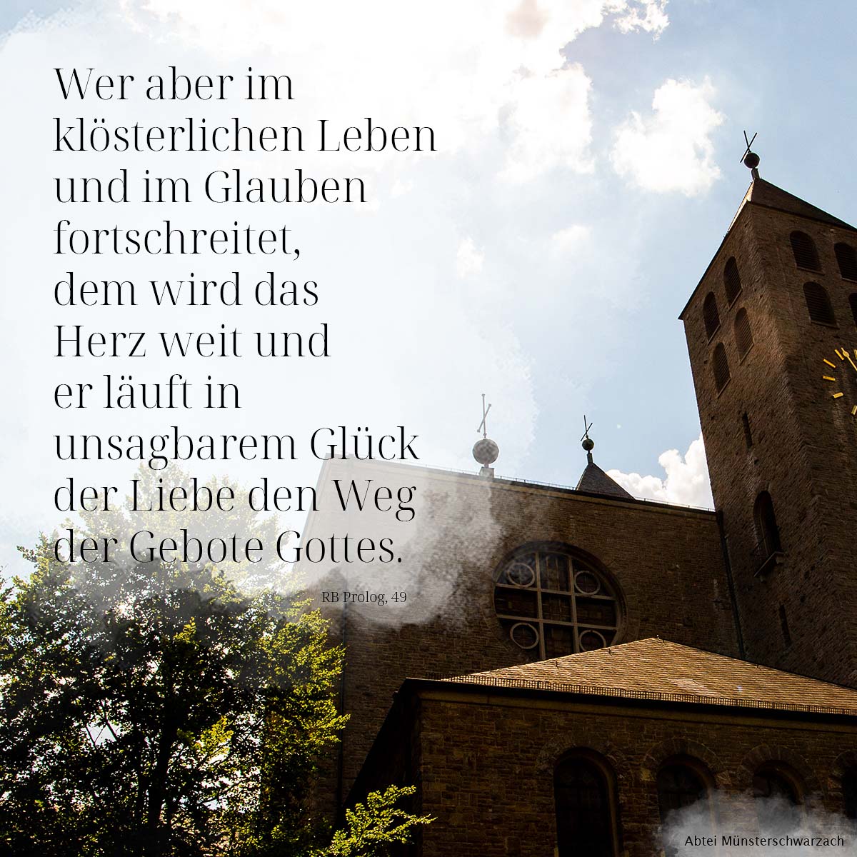 49. Wer aber im klösterlichen Leben und im Glauben fortschreitet, dem wird das Herz weit und er läuft in unsagbarem Glück der Liebe den Weg der Gebote Gottes.