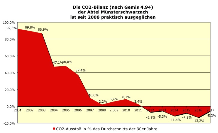 Wie seit 2008 ist unsere deutlich Bilanz "negativ", was den Ausstoß an Kohlendioxid angeht. Da wir mehr als das doppelte an regenerativem Strom erzeugen, als wir selbst verbrauchen, haben wir einen Überschuss an CO2 und auch an regenerativer Energie. Wenn wir diesen Überschuss verrechnen, kommen wir auf -5,3% vom Durchschnitt der 90er Jahre an Emissionen (d.h. die Abtei Münsterschwarzach ist eine "Kohlenstoffidoxidsenke"). Bei der Energiebilanz kommen wir damit auf über 93% Regenerativer Energie in 2017 gegenüber noch 99% in 2016.