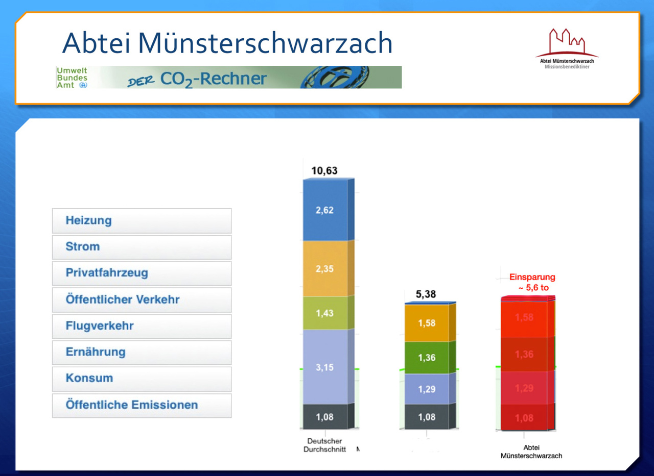 Eine Auswertung ergab für einen Mönch der Abtei Münsterschwarzach etwa 5,4 to Kohlendioxid pro Jahr - also nur die Hälfte der Emissionen eines "Durchschnittss-Deutschen". Vorteile liegen für uns in der gemeinsamen Lebensweise, der Regenerativen Wärme- und Stromerzeugung, der günstigen Verbräuche der Verkehrsmittel, kaum Flugzeugreisen im Durchschnitt und der Fleichreduzierten Ernährung.