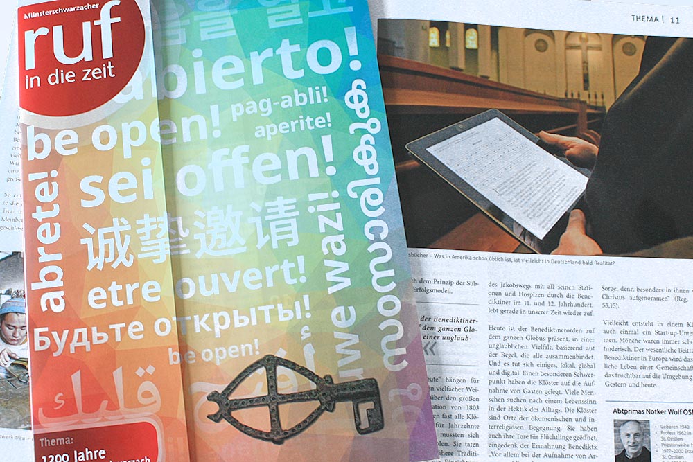 Das Jubiläumsjahr „1200 Jahre Abtei Münsterschwarzach“ steht im Mittelpunkt der Mai-Ausgabe unserer Missionszeitschrift „Ruf in die Zeit“. Dabei präsentiert sich die Titelseite so bunt und vielfältig wie das Leben von uns Mönchen in den zwölf Jahrhunderten unserer Geschichte. Zentral ist optisch wie thematisch das Motto des Jahres „be open! – sei offen!“