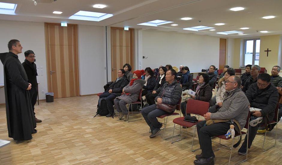 Pater Christoph Gerhard erläutert benediktinisches Verständnis von Spiritualität und Arbeit – Bruder Edmar Schäfer führt Gruppe über Abteigelände - Strahlende Augen: Pater Anselm Grün signiert Buch für einen Koreaner