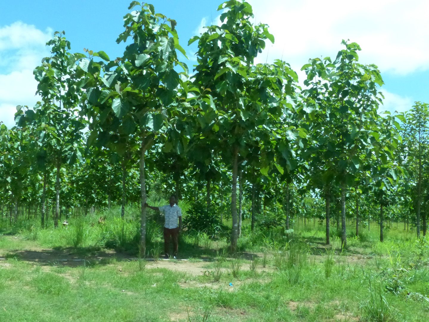 Acht Jahre nach dem Anpflanzen zeigt Br. Cassian (Abtei Peramiho) stolz die kräftigen Teakbäume