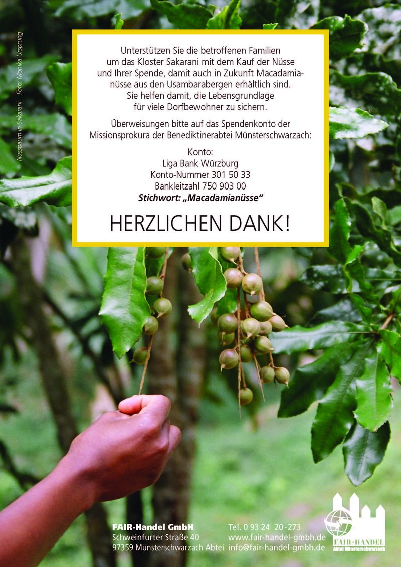 Unterstützen Sie die betroffenen Familien um das Kloster Sakarani mit dem Kauf der Nüsse in unserem Fair-Handel oder Ihrer Spende (Stichwort: „Macadamianüsse“), damit auch in Zukunft Macadamianüsse aus den Usambarabergen erhältlich sind. Sie helfen damit, die Lebensgrundlage für viele Dorfbewohner zu sichern.