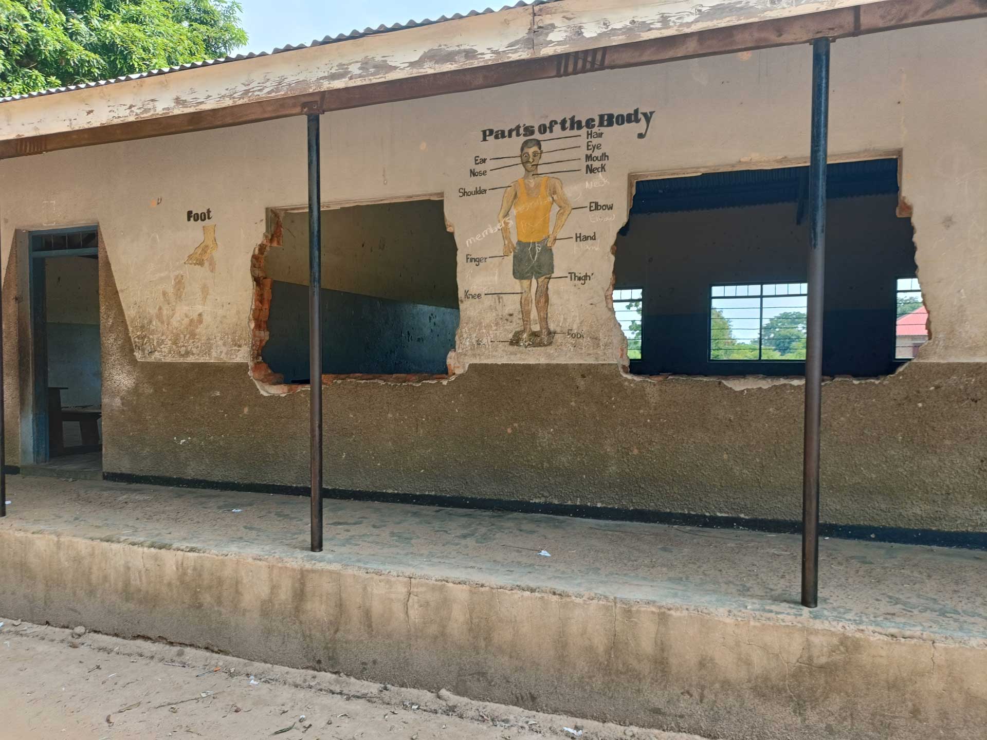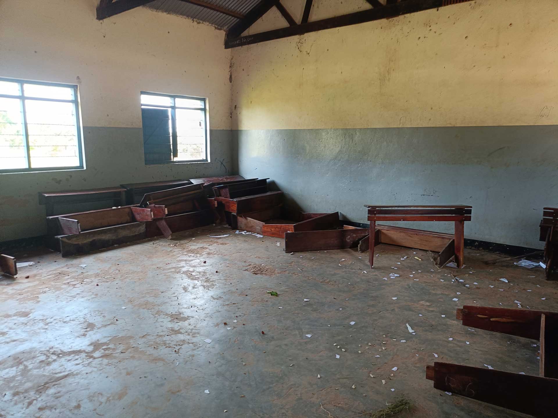 Die Dächer der Schulen sind Gott sei Dank noch in Ordnung, aber während des Konflikts wurden alle Türen und Fenster gestohlen. Die Schulbänke, Schreibtische, Bürotische, die Schulbibliothek und das Schullabor wurden komplett zerstört. Auch die Betten in den Schlafsälen der Grund- und Sekundarschule wurden ruiniert. Das Internat funktioniert, indem die Schülerinnen und Schüler ihre Matratzen auf den Boden legen. Das ist eine große Herausforderung, denn während der Regenzeit ist es ziemlich kalt.